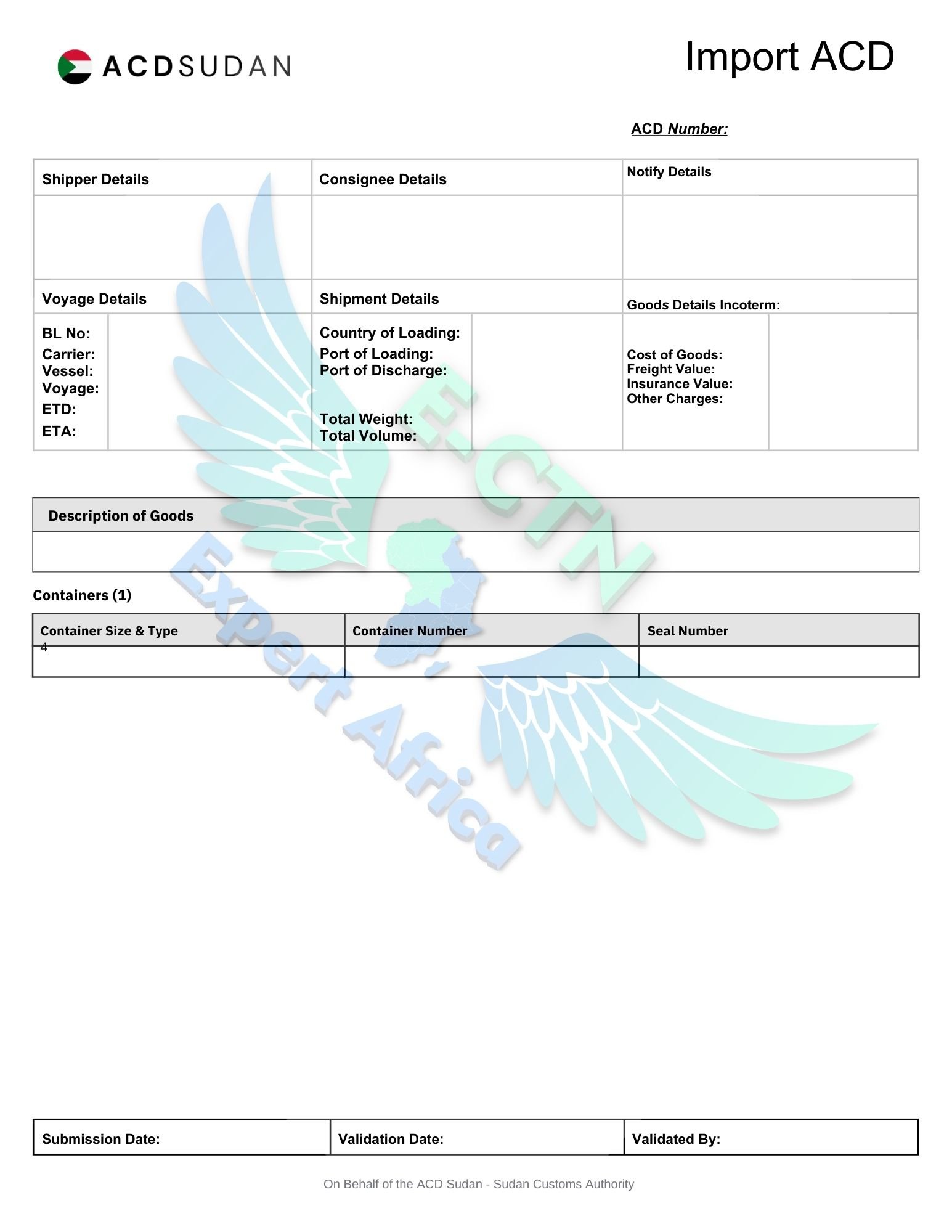 • All customers exporting cargo to Sudan must obtain an ACD Number from the official Sudanese Government ACD platform prior to cargo loading at origin and so ECTN EXPERTS are here to help you get your ACD for SUDAN